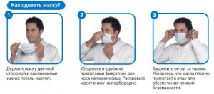 - Удерживая маску за завязки или резинки вплотную поднести к лицу белой стороной внутрь и фиксировать завязками (резинками) в положении, когда полностью прикрыта нижняя часть лица – и рот, и нос.
