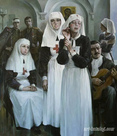 Сестра милосердия. 1992 г. Александр Максович Шилов (1943 г.р.) Шилов не признает абстрактной живописи и декларирует конкретность и реалистичность искусства, которое должно быть понятно любому зрителю. Его картины отличает фотографическое сходство, детальность прорисовки, любовь к фактурам.. |