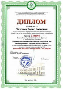 1 место в номинации “История медицины: с древнейших времен до современности” с проектом “История медицины в лицах”, авторы: Чехонин Борис Иванович, Шатько Сергей Олегович, руководитель Сидорович Инна Янушевна.