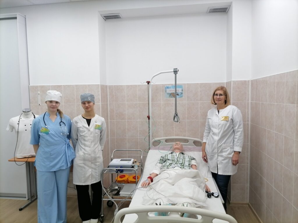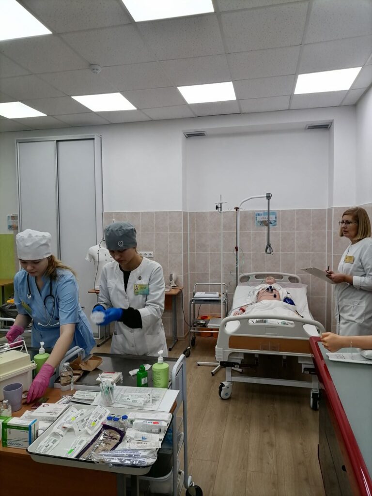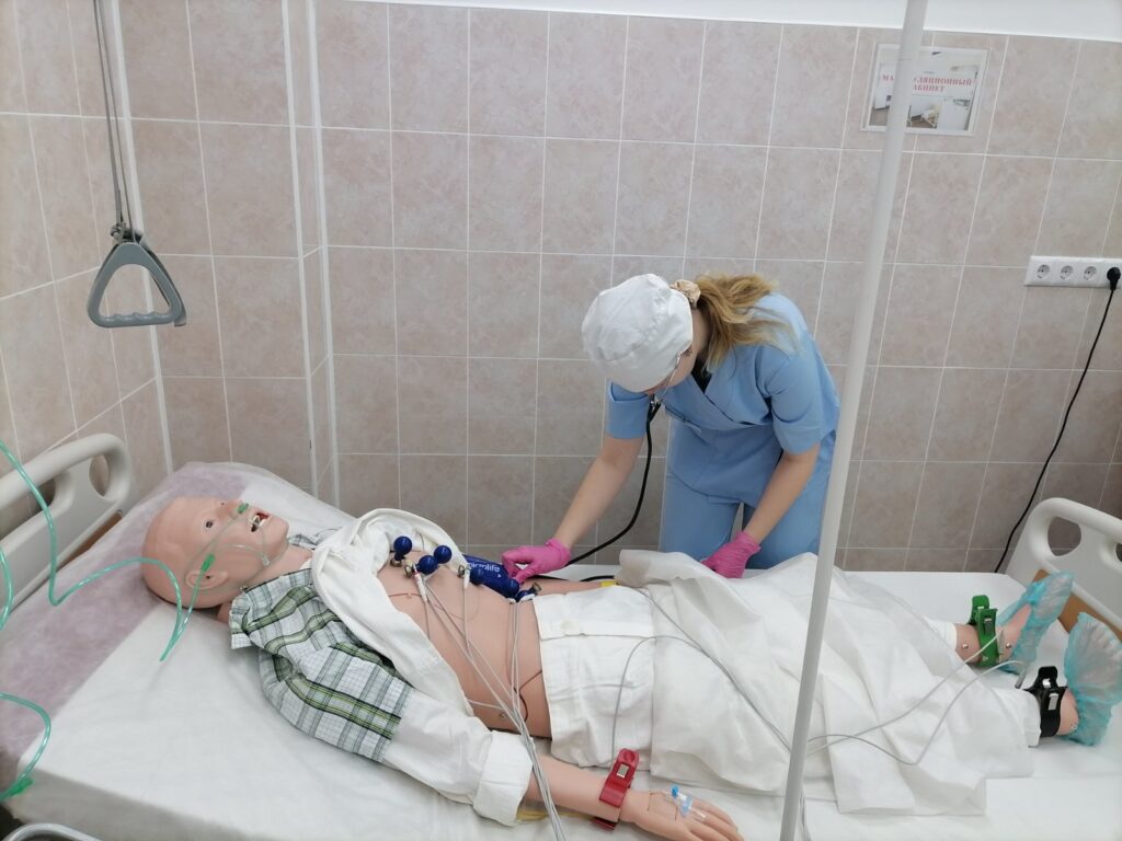 Была смоделирована клиническая ситуация в палате терапевтического отделения.  Учащиеся   под руководством преподавателей отработали на полноростовом тренажёре по уходу за пациентом алгоритм действий медицинских работников при остром коронарном синдроме, научились работать в команде.