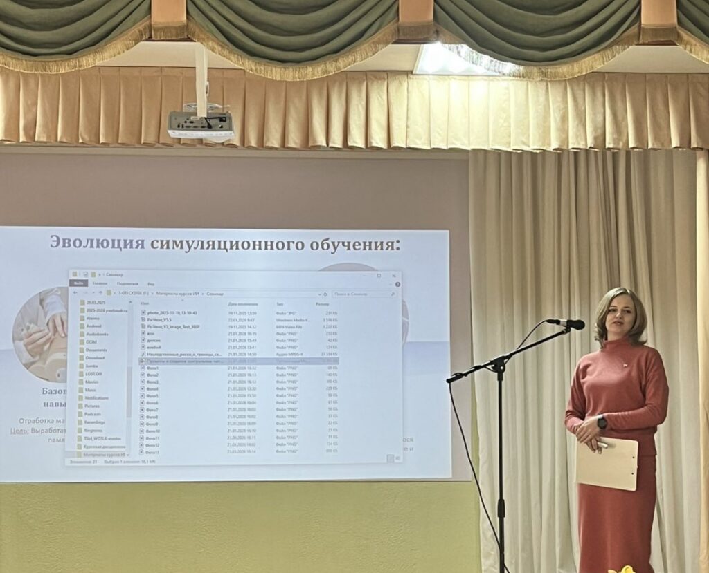 С темой «Симуляционное обучение в медицине: от базовых навыков к сложным клиническим сценариям с использованием ИИ» перед участниками семинара выступила заведующий лабораторией по отработке навыков Юлия Николаевна Базан.