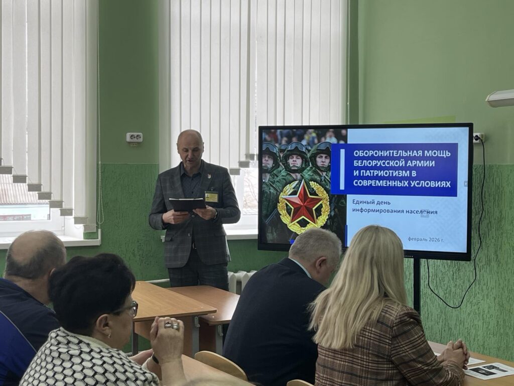 19 февраля 2026 года в Слонимском медицинском колледже прошел единый день информирования. Ключевая тема «Оборонительная мощь белорусской армии и патриотизм в современных условиях». Информационно-пропагандистская группа в составе директора колледжа Грипича А.И., заместителя директора по учебной работе Крот О.К., преподавателя, председателя профсоюзного комитета работников колледжа Кисляка В.Л. осветили ключевые аспекты национальной безопасности, современное состояние и перспективы развития Вооруженных Сил Республики Беларусь. Особый акцент был сделан на вопросах патриотического воспитания как фундаментальной основы защиты государства и общественно-политической стабильности в стране. Также затронуто много дополнительных профилактических вопросов: о противопожарной безопасности, об ответственности за совершение преступлений коррупционной направленности.