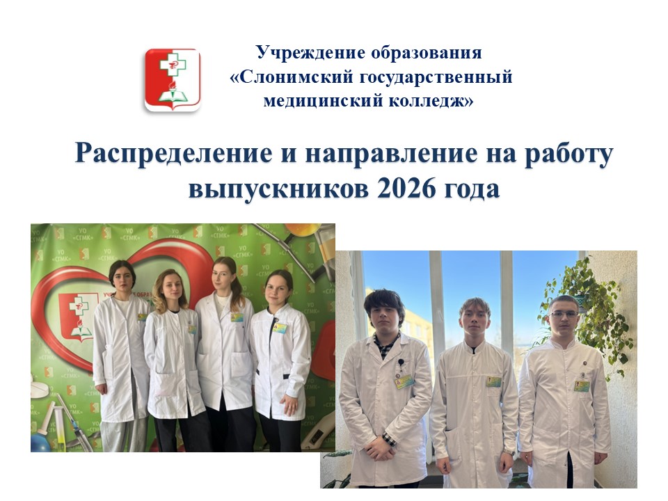 9 марта 2026 г. (понедельник) состоится окончательное распределение и направление на работу выпускников учреждения образования «Слонимский государственный медицинский колледж». Место проведения: г. Слоним, ул. Войкова, 20, ауд. 101. Начало в 10:30 ч
